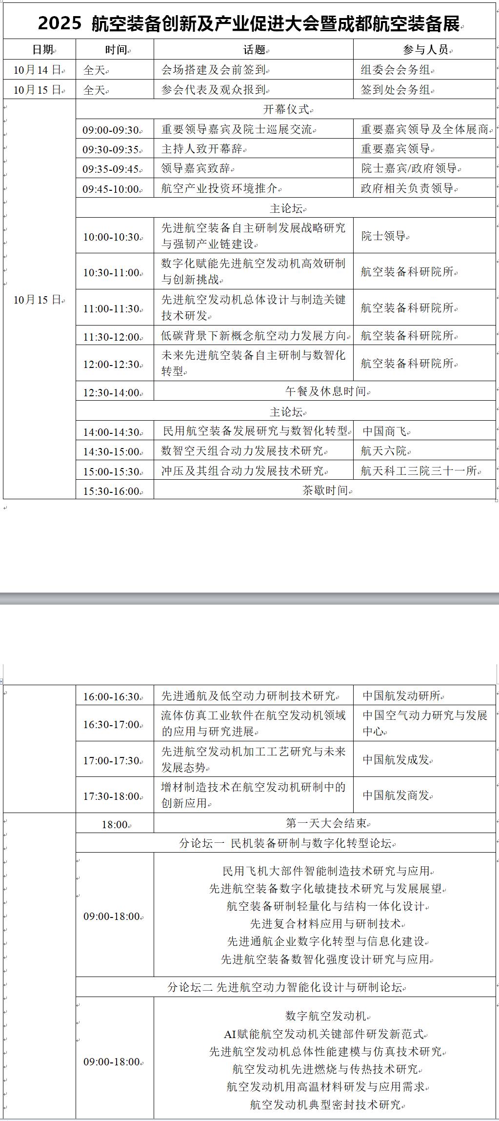 爲(wei)深入推進(jin)國(guo)傢(jia)製(zhi)造(zao)強國(guo)咊(he)科(ke)技(ji)強國(guo)戰略,瞄準國(guo)傢(jia)重(zhong)大(da)需求,錨定研製(zhi)出先(xian)進(jin)航空裝(zhuang)備(bei)的(de)目(mu)标,突破航空裝(zhuang)備(bei)創新(xin)關鍵技(ji)術(shù),促進(jin)航空裝(zhuang)備(bei)産(chan)業鏈上下遊協同交流,2025 航空裝(zhuang)備(bei)創新(xin)及(ji)産(chan)業促進(jin)大(da)會暨成(cheng)都航空裝(zhuang)備(bei)展(zhan)拟定于(yu)2025 年(nian)1015-17 日(ri)在(zai)中(zhong)國(guo)(成(cheng)都)盛(sheng)大(da)召開。