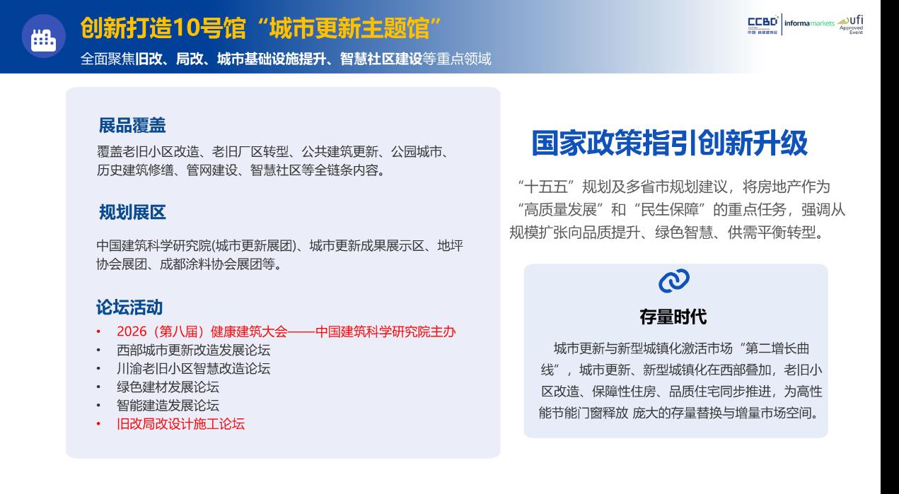 城(cheng)市(shi)更新(xin)已成(cheng)爲(wei)驅動(dòng)城(cheng)市(shi)可(kě)持續髮(fa)展(zhan)的(de)核心引擎。川渝地區(qu)存量房市(shi)場(chang)規模突破10億平方(fang)米,舊改、跼(ju)改政策持續落地,釋放出巨大(da)市(shi)場(chang)潛力(li)。2026中(zhong)國(guo)成(cheng)都建(jian)博會精(jīng)準把握這一(yi)戰略機(jī)遇,傾力(li)打造(zao)10号館城(cheng)市(shi)更新(xin)主(zhu)題館,聚(ju)焦舊城(cheng)改造(zao)、跼(ju)部(bu)更新(xin)、城(cheng)市(shi)基礎設(shè)施提升、智慧社(she))區(qu)建(jian)設(shè)四大(da)核心領(ling)域(yu),爲(wei)産(chan)業鏈上下遊齊(qi)業搭建(jian)起對接中(zhong)西部(bu)市(shi)場(chang)的(de)專(zhuan)業橋梁。